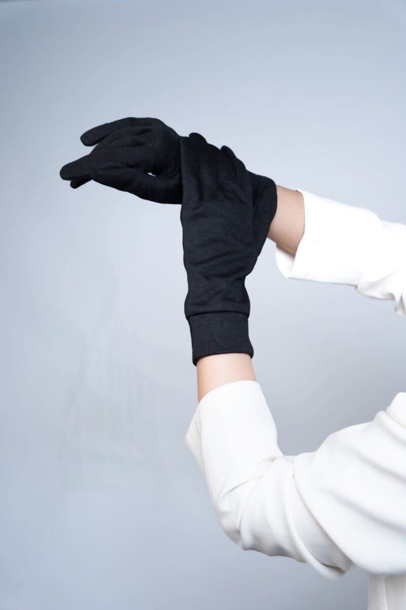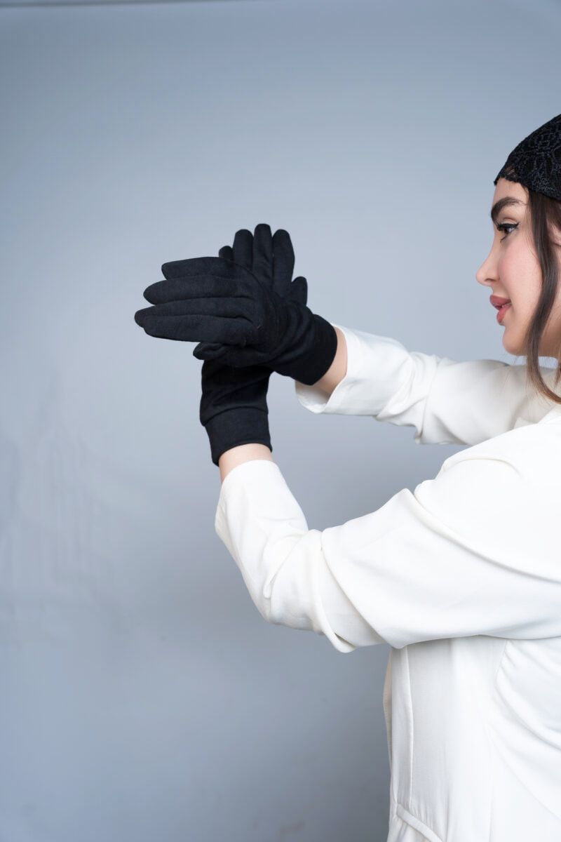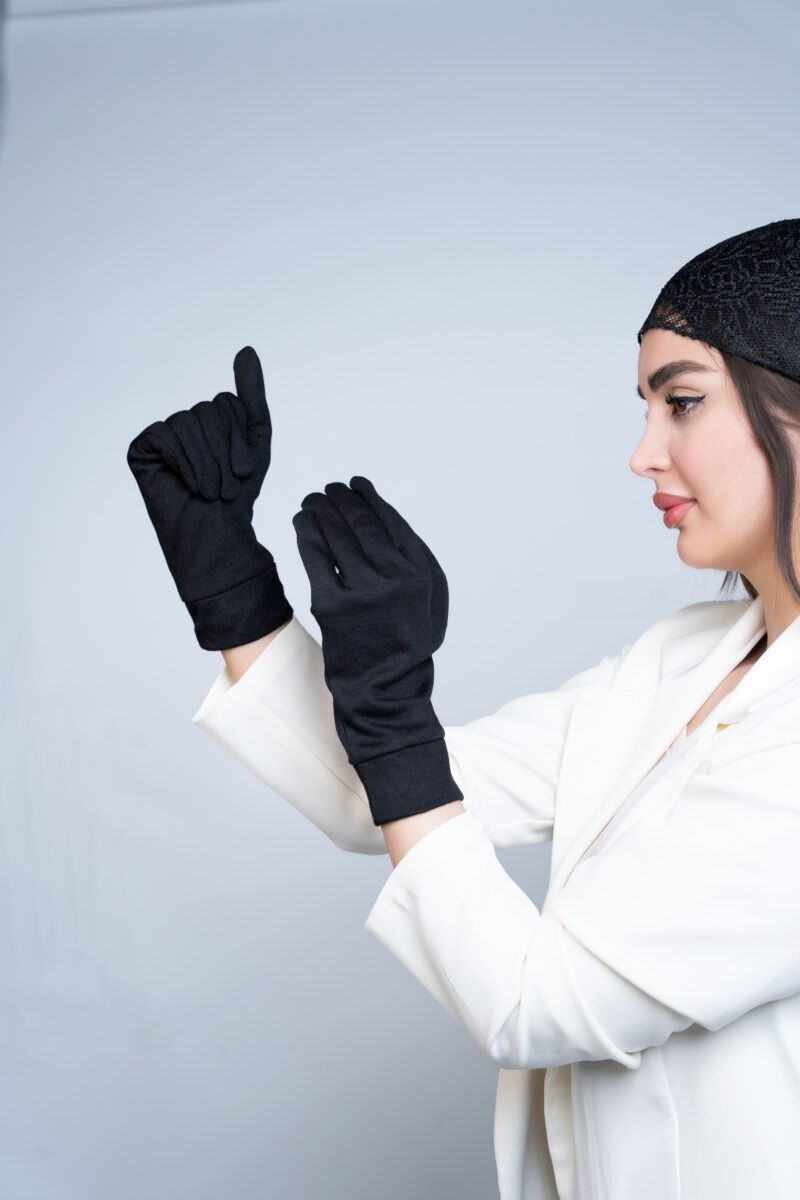 These gloves are perfect for women who want modest hand coverage without the formality of satin or lace. The soft cotton construction makes them ideal for daily errands, commuting, outdoor activities, and casual outings. The ruched and gathered texture means minor imperfections in fit are naturally concealed, making them forgiving and comfortable across different hand sizes. The deep black color is rich, consistent, and pairs with virtually any outfit in a modest wardrobe. As seen in the photos, these gloves look stunning paired with a crisp white button-down shirt, proving that modest basics can be both simple and chic.