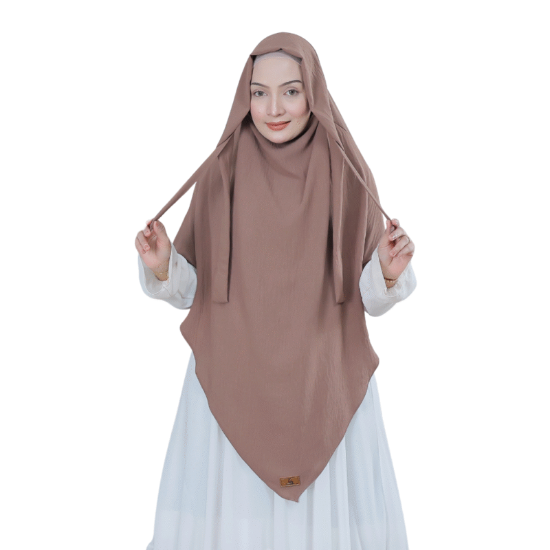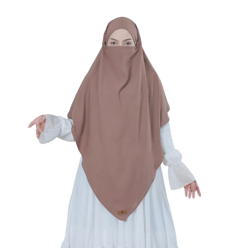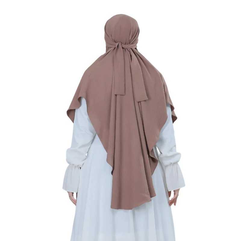 - Design: Single-layer, streamlined khimar style that falls neatly over the chest and shoulders. Its simplicity allows the rich color and texture to take center stage. It is accented only by a small, attractive faux leather brand tag near the front hem.
