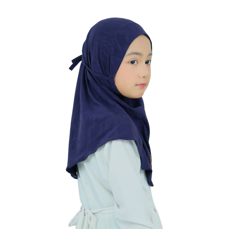 The Elegant Navy Blue Hijab for Kids blends modesty with sophisticated charm. Its rich navy tone, unique subtle leaf pattern, and simple design make it a versatile choice for both everyday wear and festive occasions, ensuring a graceful and stylish appearance.