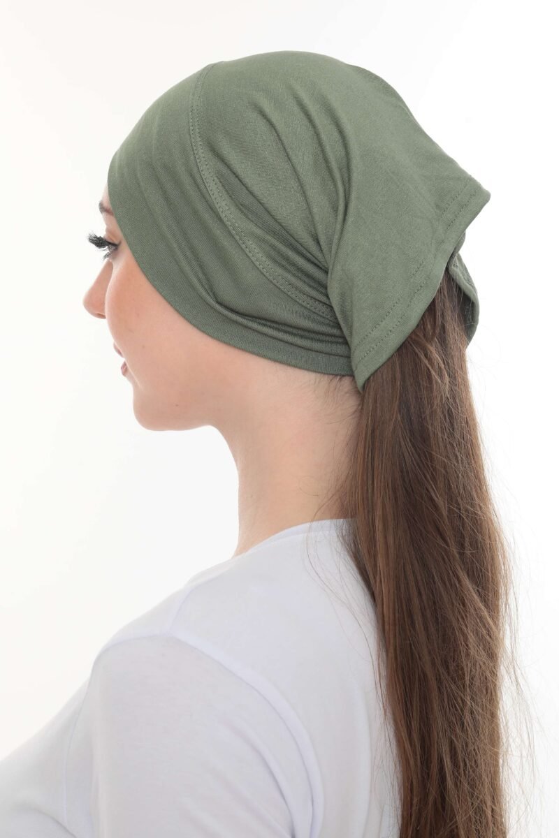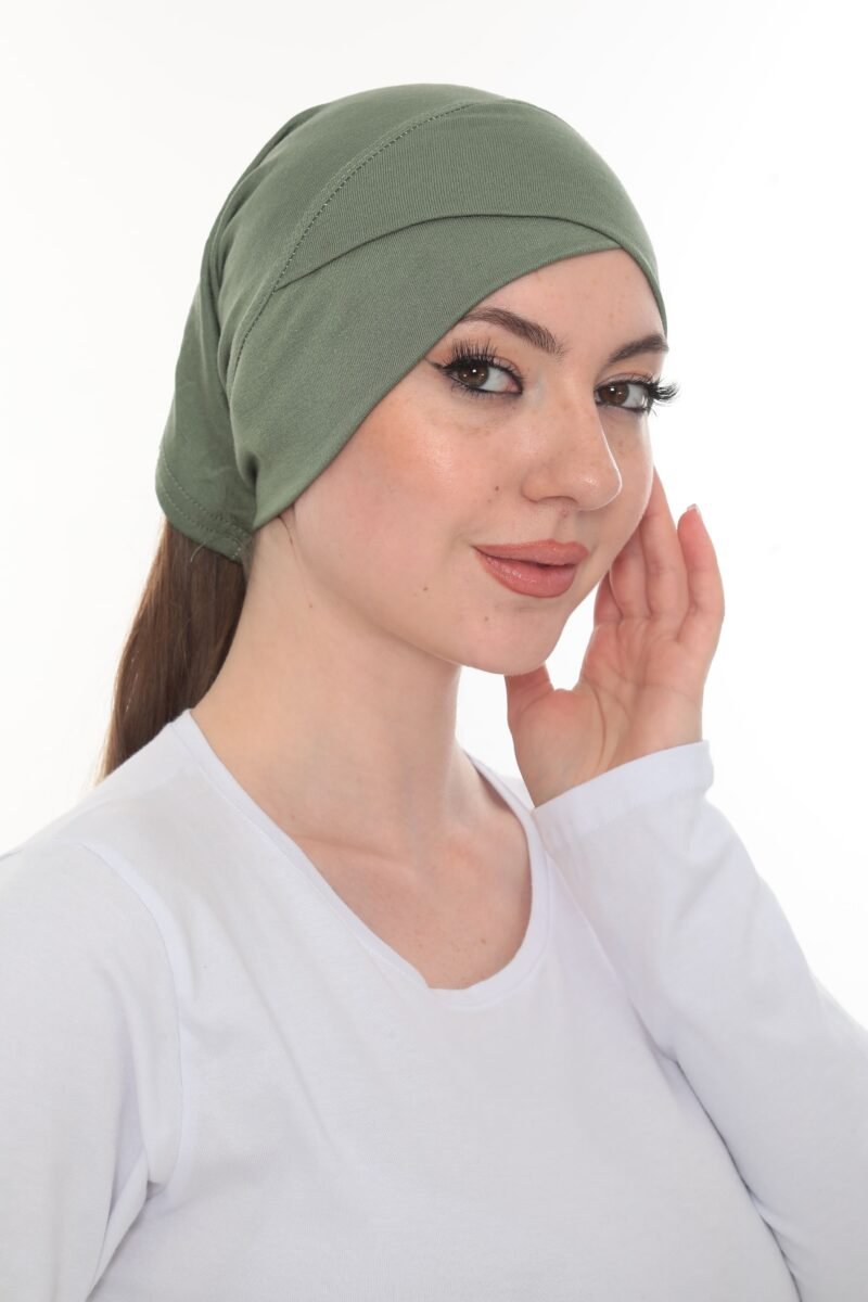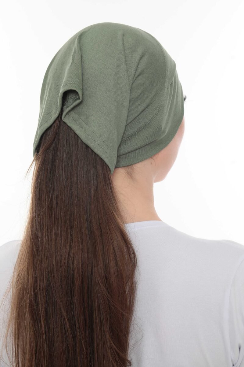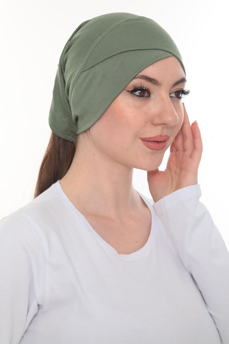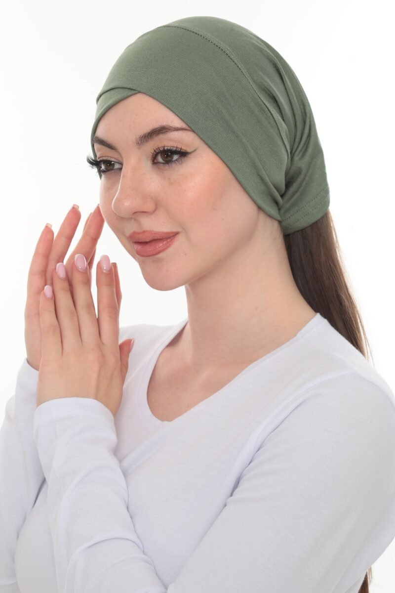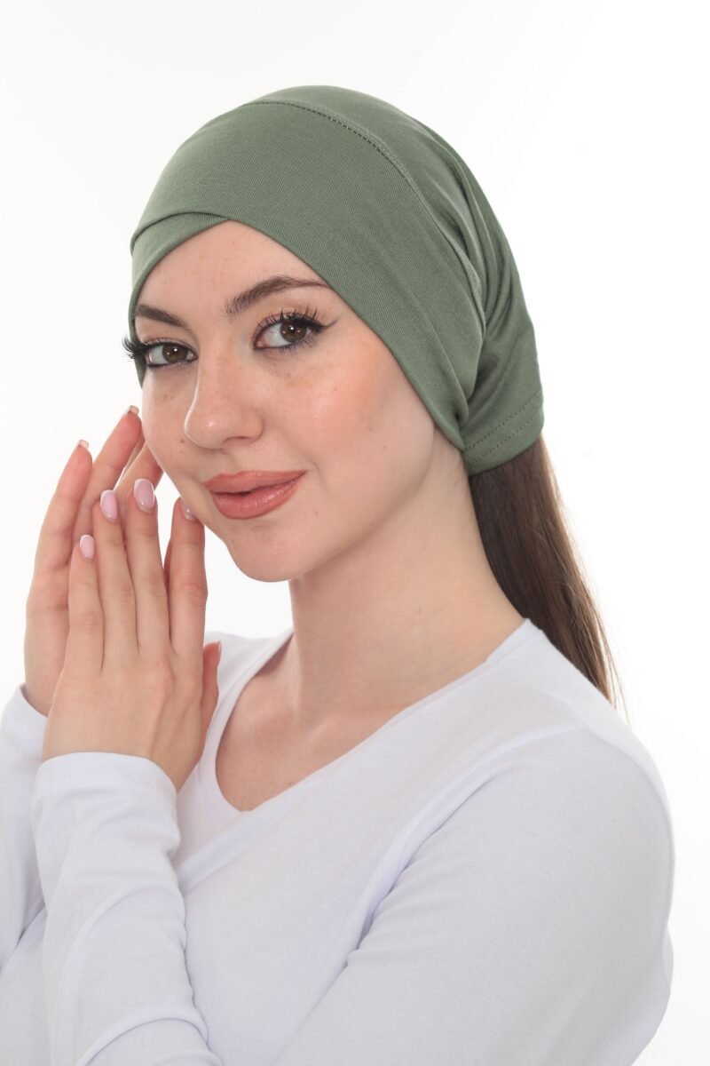 The Fashionable Olive Green Crossover Turban is a pre-tied, full-coverage cap designed for a stylish, structured look with zero hassle. Crafted from a soft, lightweight stretch material, this turban features a flattering crossover or twist detail across the forehead that creates subtle volume and shape, offering effortless chic modesty in seconds.