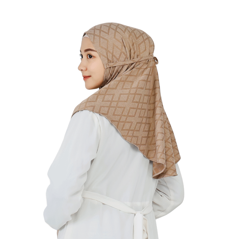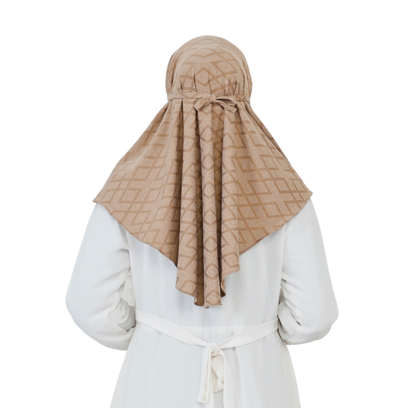The Chic Geometric Patterned Beige Hijab for girls is an elegant and modest headscarf designed for both refined everyday wear and special occasions. It features a beautiful warm beige or light brown hue, enhanced with a subtle, all-over textured geometric diamond or interlocking pattern, and includes a small brand tag at the front. This hijab provides graceful full coverage with a polished and contemporary look.