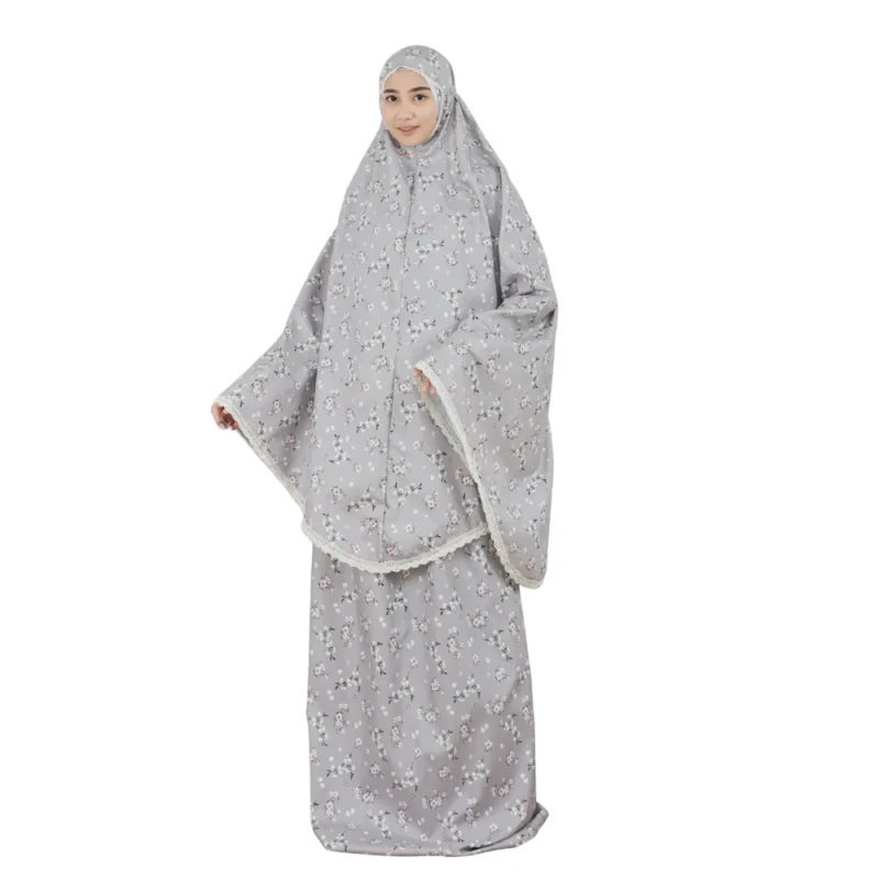 - Design: Traditional two-piece Mukena set (a long top/khimar and a matching skirt) designed to provide full-body coverage, excluding the face. The edges of the top layer and the skirt hem are finished with a pretty, contrasting lace trim (light beige/white) for a feminine touch.