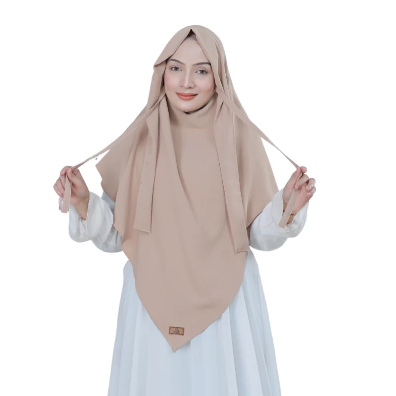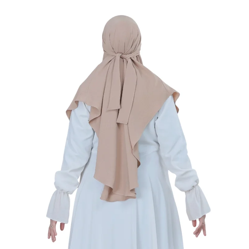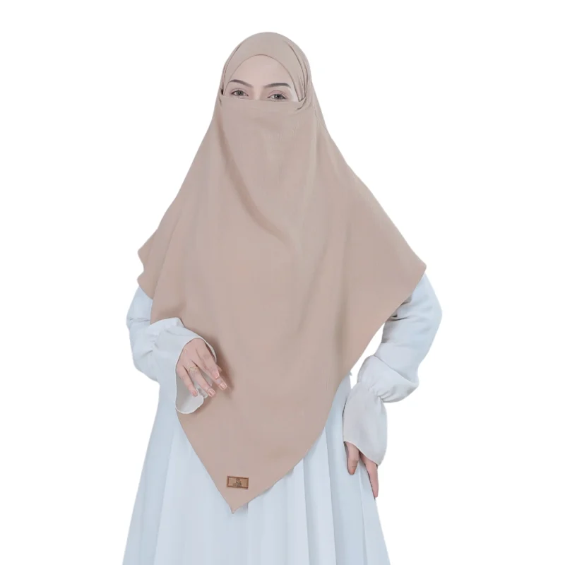 - Design: Single-layer, streamlined khimar style with a clean finish and a triangular hemline over the chest. The design is completely unadorned, allowing the quality of the fabric and the color to stand out. It is accented only by a subtle, rectangular faux leather brand tag near the hem.