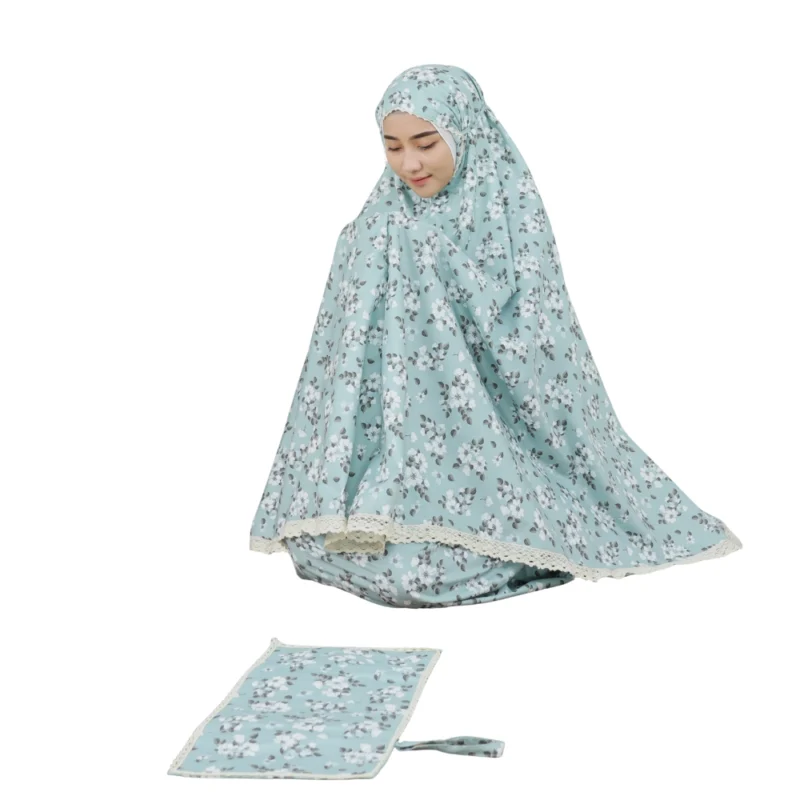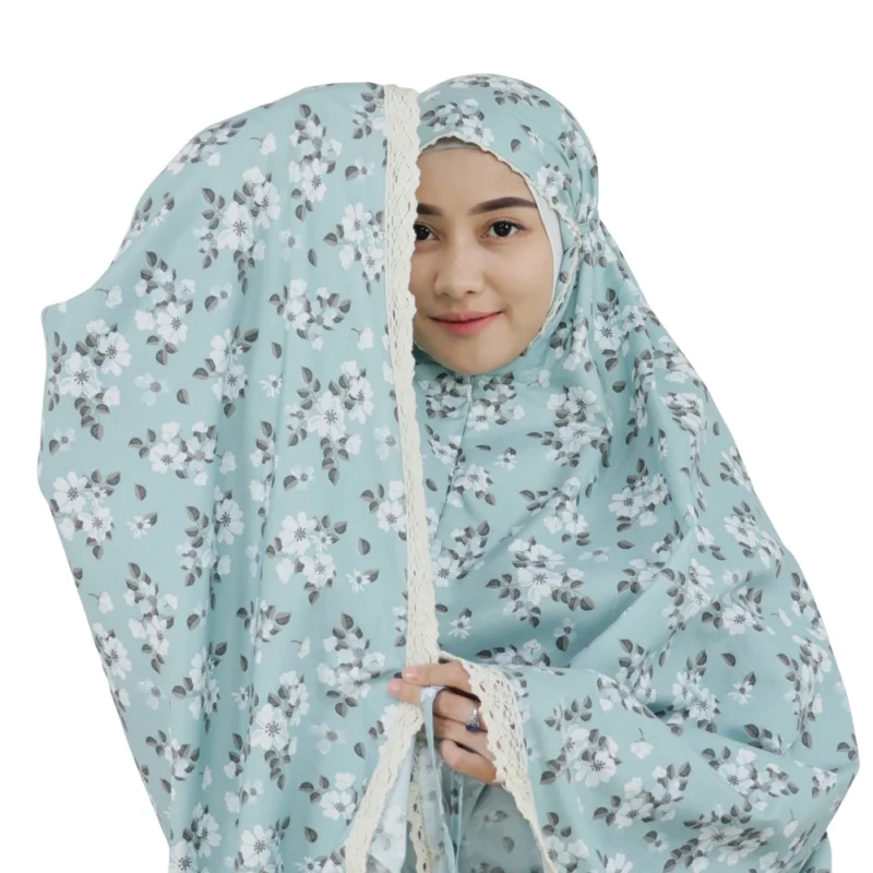 • Design: Traditional two-piece Mukena set (a long top/khimar and a matching skirt) that provides full-body coverage, excluding the face. The edges of the top layer and the skirt hem are finished with a pretty, contrasting lace trim (light beige/white) for an added feminine touch.