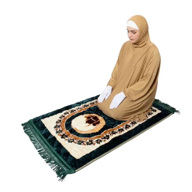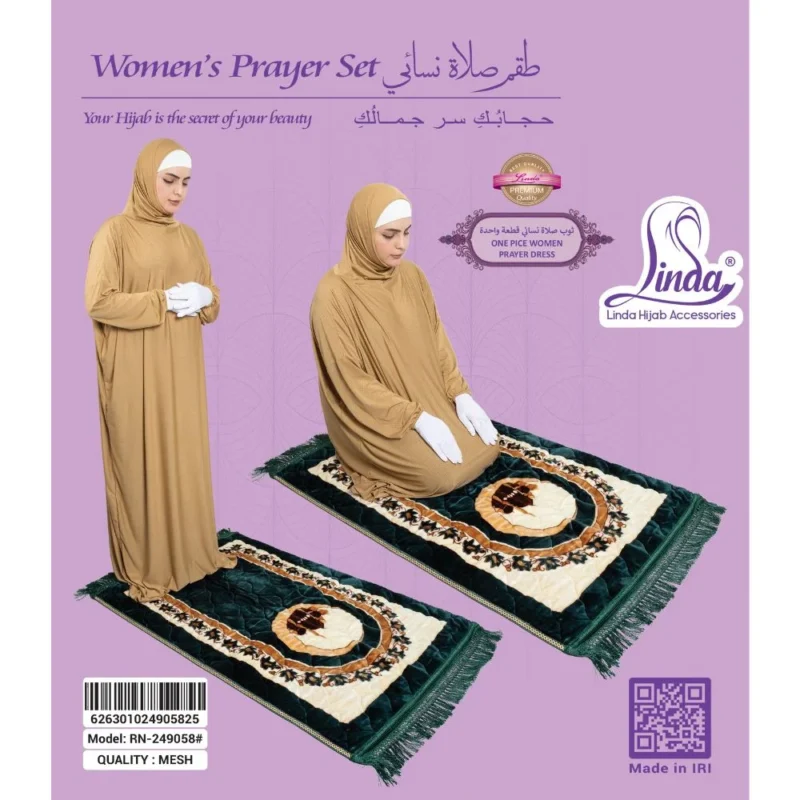 As beautifully demonstrated across all three product photos, this prayer dress is styled with crisp white gloves, providing complete hand and wrist coverage to complement the full-body coverage of the dress. The white gloves coordinate naturally and elegantly with the white inner cap band visible at the forehead, creating a clean, cohesive, and intentional look of total modest coverage. The contrast of the white gloves against the warm camel tone of the dress is subtle and refined — not stark or jarring, but quietly beautiful. For women who observe complete hand coverage during prayer, this dress pairs perfectly with white gloves for a fully covered, dignified, and elegant prayer appearance.