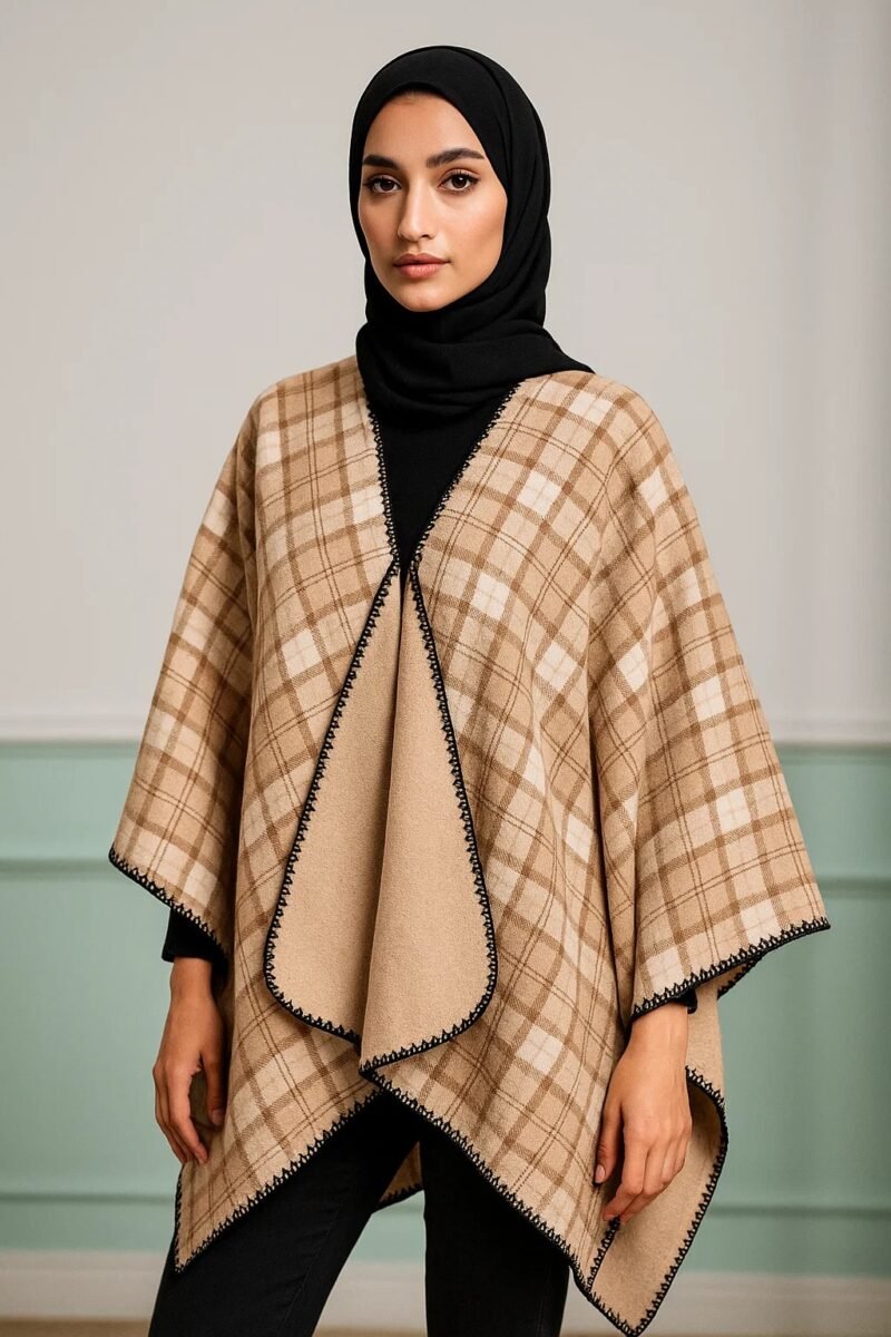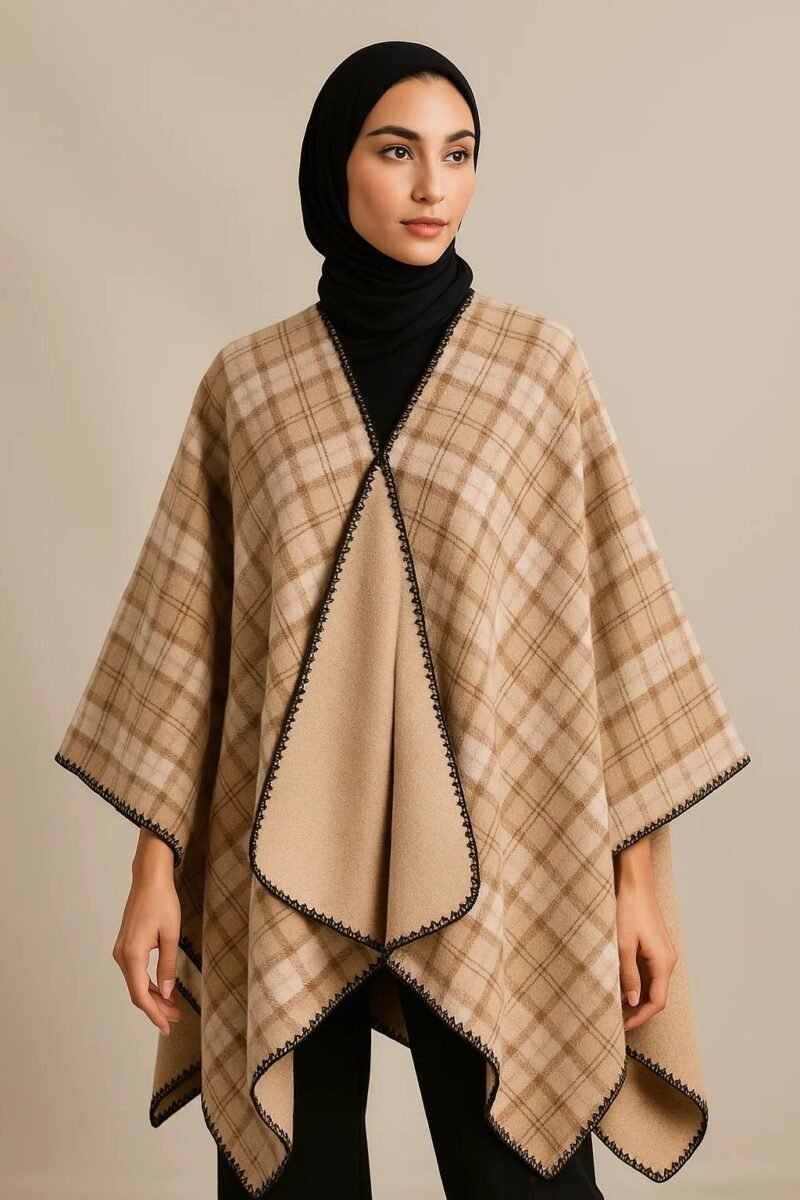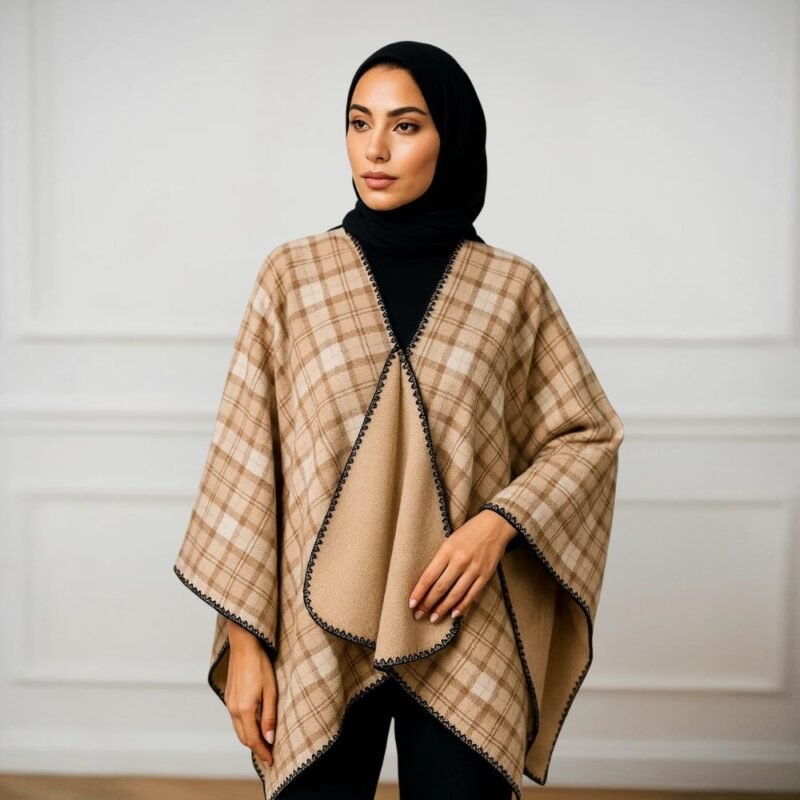 Be the first to review “Women’s Winter Reversible Poncho – Warm Checkered Shawl for Hijabi & Modest Wear | Elegant Open-Front Abaya Outerwear Cape (Camel & Tan)”